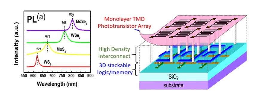 Enabling monolithic 3D image sensor using large area monolayer transition metal dichalcogenide and logic/memory hybrid 3D+IC